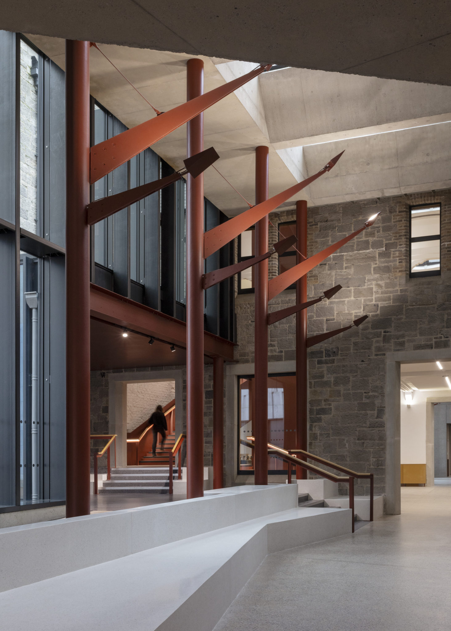 It includes a lively ground floor with student services, a café, exhibition space and Learning Commons. On the upper levels is the new Academic Hub for the Campus. It is envisaged as a light-filled lantern providing views across the city landscape, the building is a showcase for learning, research and academic activities. These fundamental principles informed the design of the scheme.