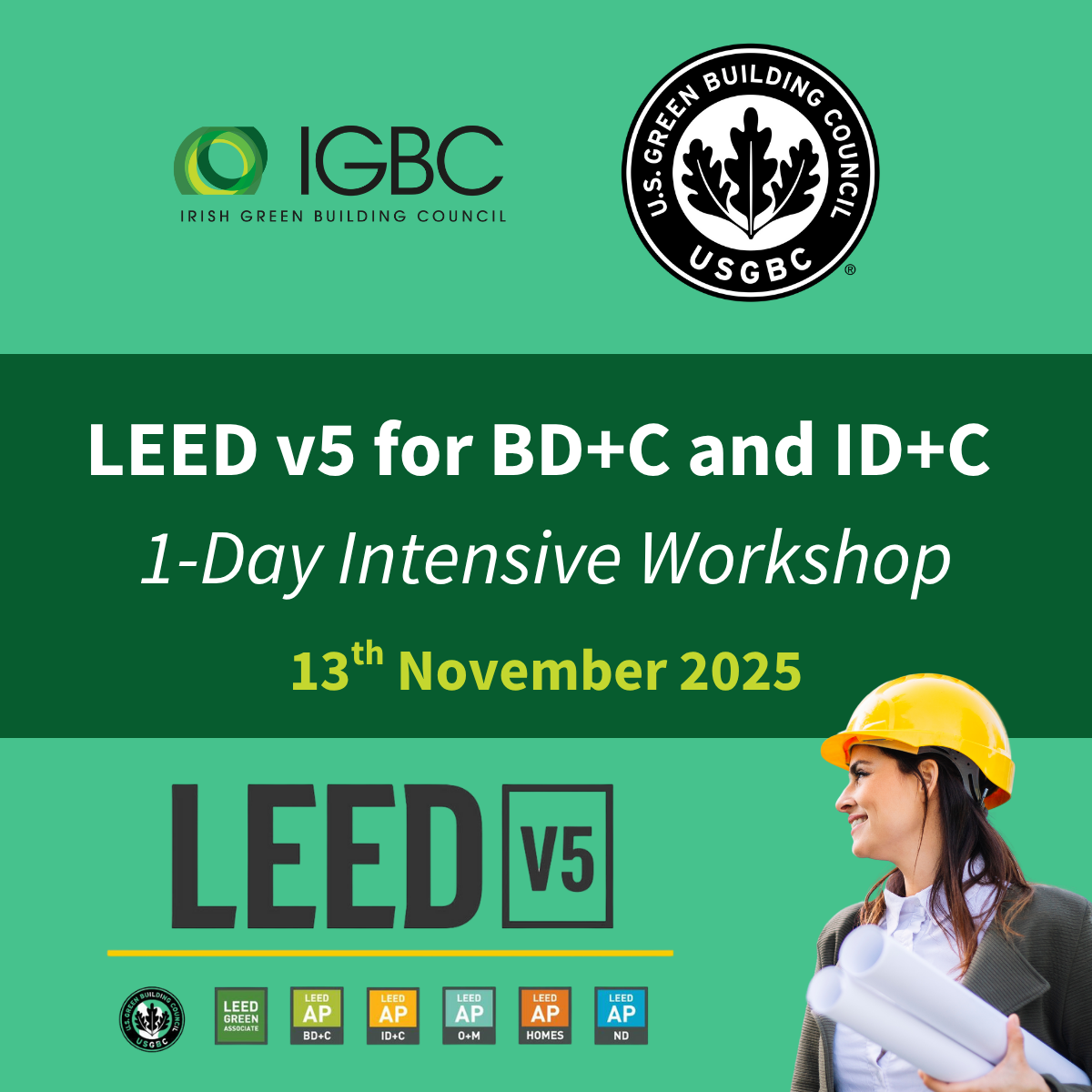 The Irish Green Building Council (IGBC), in collaboration with the U.S. Green Building Council (USGBC), invites you to a one-day intensive workshop on LEED v5 for Building Design and Construction (BD+C) and Interior Design and Construction (ID+C).